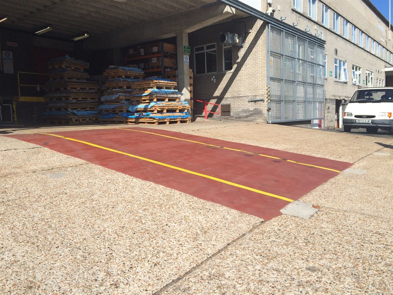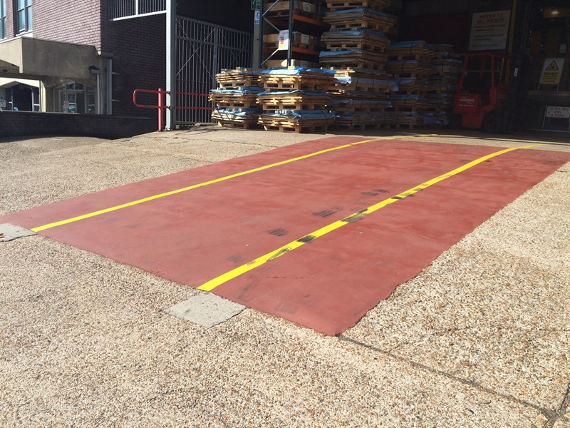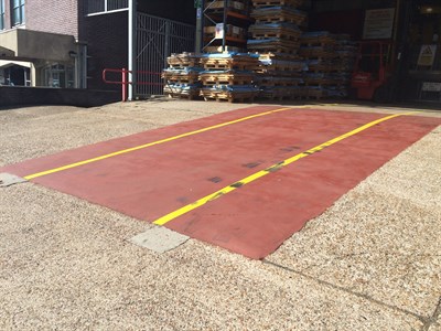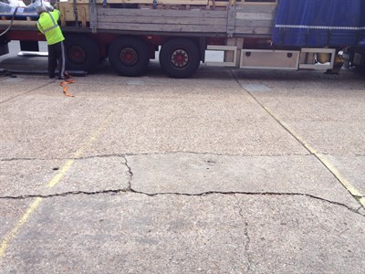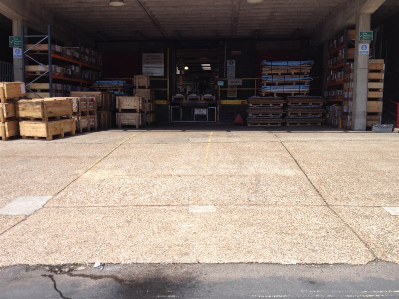 Problem: The loading Bay to this factory has a gradient levelling off down at road level. When lorries load and unload they have to reverse from the road up the gradient and into the loading area. At the start of the gradient lorries wheels lose traction causing abrasion and damage to the concrete. To overcome this, lorries take the run-up to the loading Bay, resulting in damage to the loading bay wall and potential injury to personnel. Over time the damage to the concrete slab has worsened making loading and unloading much more hazardous.