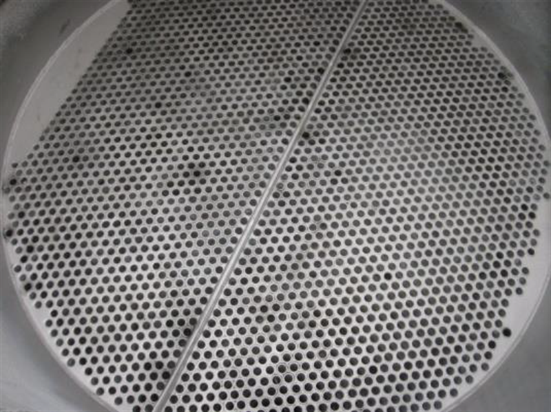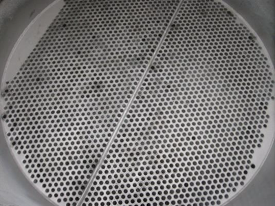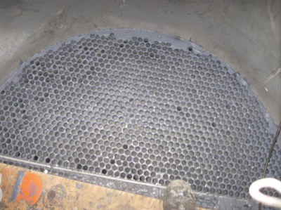 This tube sheet was horizontally situated and contained 2300 tubes. Operating at 80°C, it was decided to use Belzona 1391. The use of tapered EPDM Plugs meant that each tube opening was conical and easy to remove once material had cured.