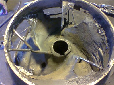 - Original conditions of the impeller. The damage is observed as well as the welded bars.