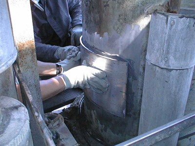 Application was carried out in accordance with Belzona Know-How System leaflet TCC-1. A formed section was made up. Belzona® 1111 was then applied to both surfaces and then assembled, using metal strapping to hold in place whilst the Belzona cured. Excess material was used as a fillet around the plate. After completion of cure the straps were removed.
