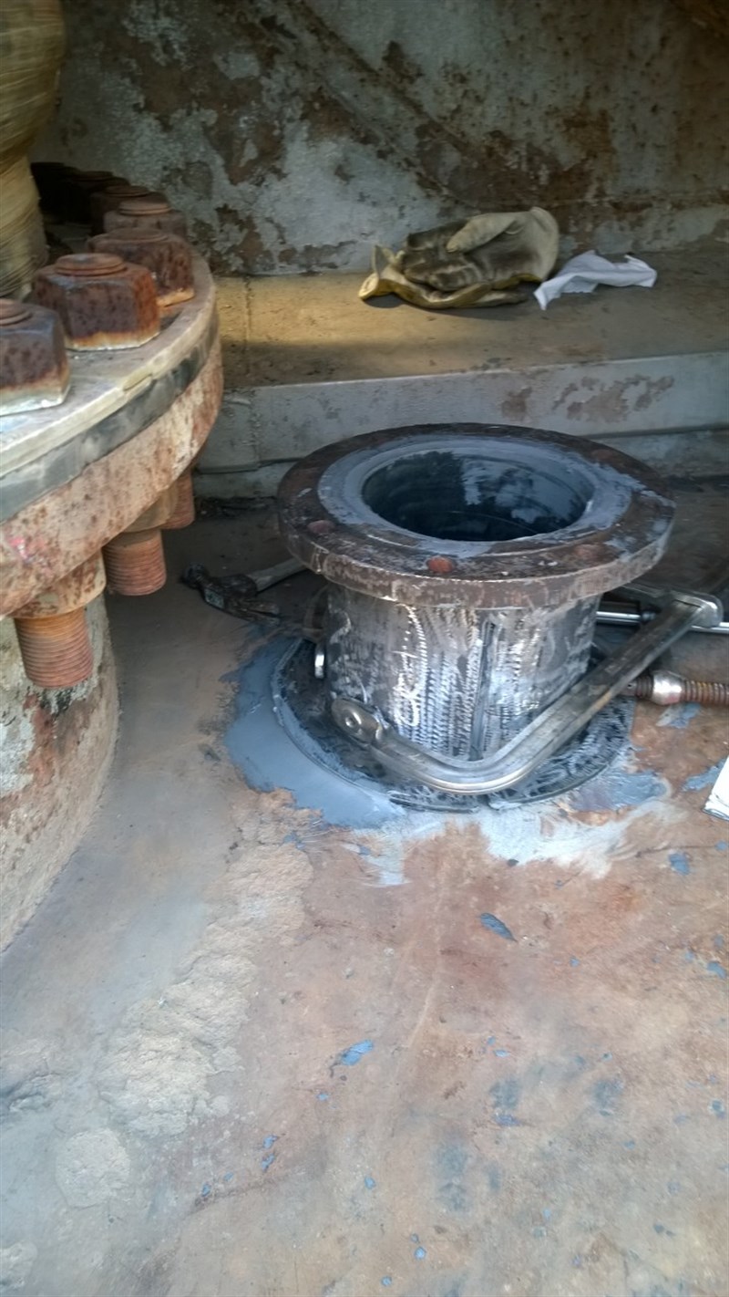 Problem: 8" pipe had corroded all the way through the pipe in several areas around it. The heat condensers were installed directly above the flange and the pipe that returned cooled water back into the plant. There was not a lot of room to work with and the customer did not know how to seal or repair. They wanted a solution that would prevent the pipe from seperating at the concrete level.