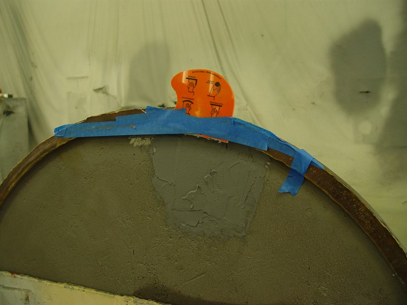 - Belzona 1111 applied with reinforcement sheet, applicator taped in place to smooth the seal area.