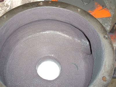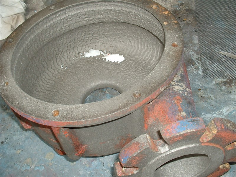 Problem: A paper pulp pump was severely damaged by abrasion because of the presence of paper clips and staples in the pulp it transports. The existing coating could not withstand this abrasive paste which caused impingement.