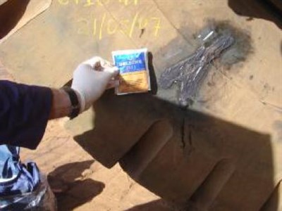 The application was conducted according to Belzona Know-How System Leaflet SHM-9. The lateral cut was opened and all the loose rubber was removed, reaching the inner liners, without exacerbating the problem. After scarification of the rubber, cleaning of the cut and application of Belzona 2911 conditioner, two repairs were made: the first one with the application of Belzona 2311 and the second one with the application of Belzona 2211.
