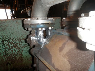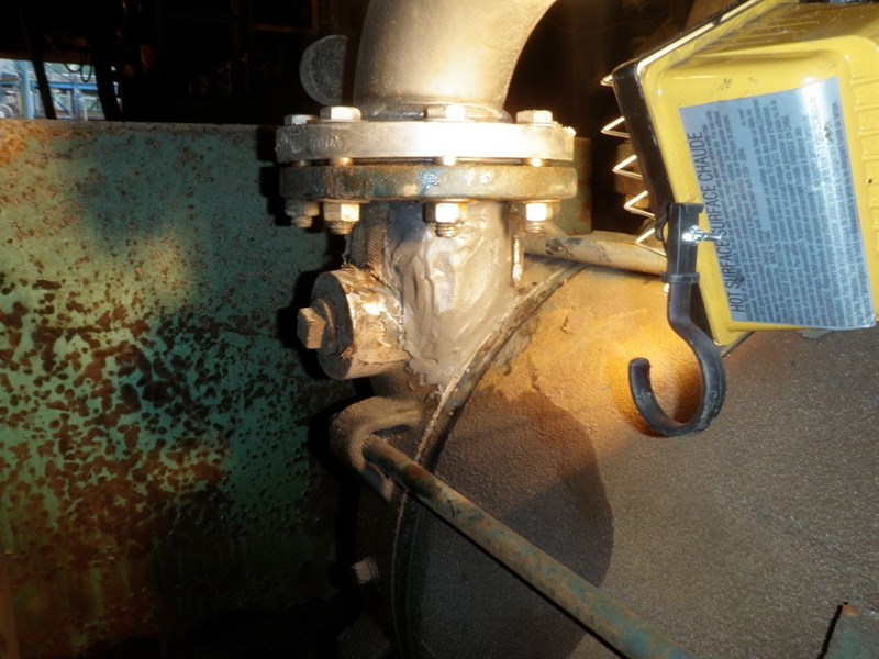 Problem: The outlet port had corroded to the point a hole had formed; a competitor's patch product had been applied but failed after a short time.