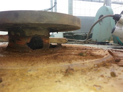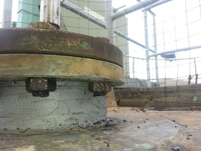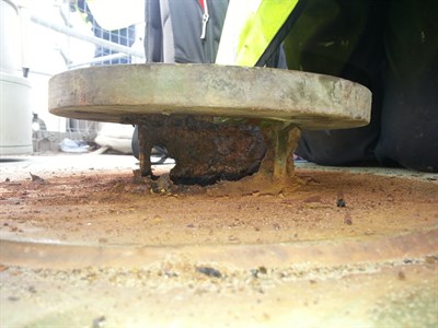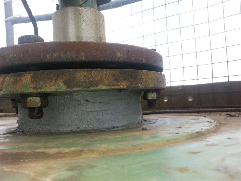 Problem: The tanks have a sensor on top for flow and level readings. They sit on an upstand with a bolted flange. The upstands had been eaten away by the corrosive fumes from the hot bitumen. They were holed through and the gases from the tanks were venting to the atmosphere.