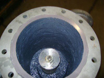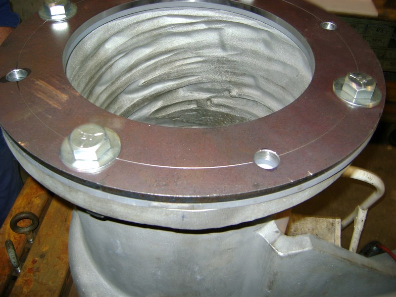 A polycarbonate flange form was bolted on the casting and Belzona® 1812 applied to fill the eroded shell and rebuild the damaged flange area. The interior was coated with Belzona® 1321 to provide a smooth the surface and the flange form was removed.