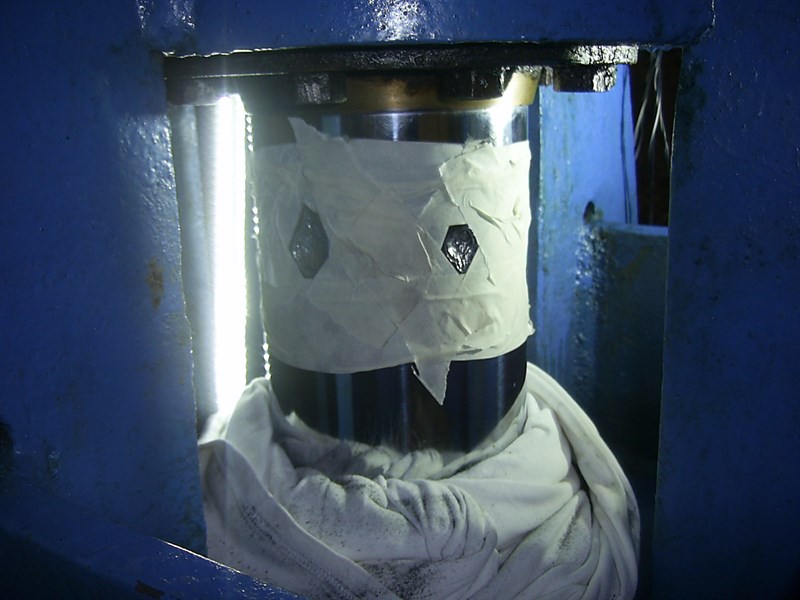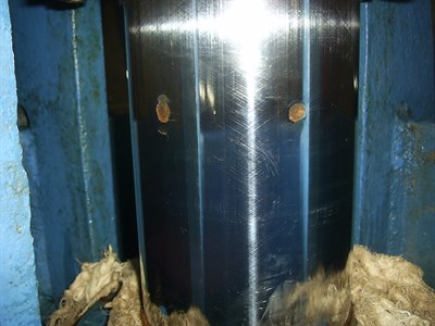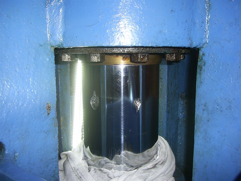Problem: Ongoing corrosion of point defects in the stainless cladding on the rams had led to the large defects now seen. Sharp edges on the defects could cause damage and rupture of the rubber seals. Repair area was only accessible through a 450x300mm window at the bottom of the hydraulic device.