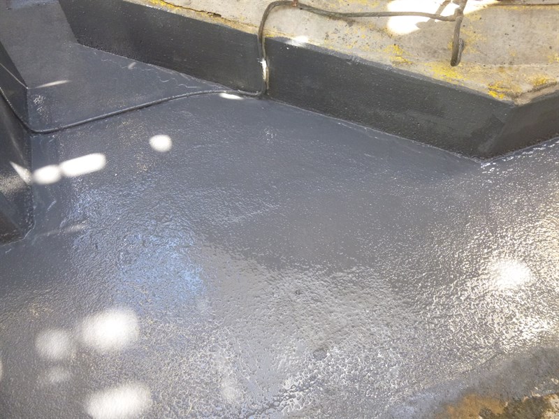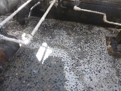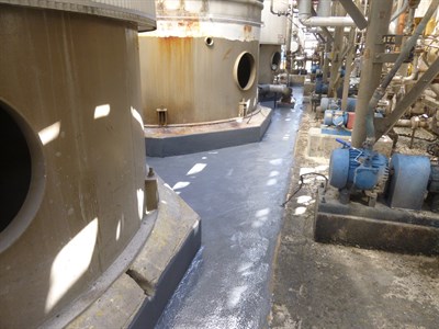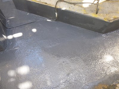 2. First part of the repair in contrast to the original condition. Belzona 4154 mixed with sand plus 2 coats of Belzona 5811. Draining rebuilt to eliminate ponding.