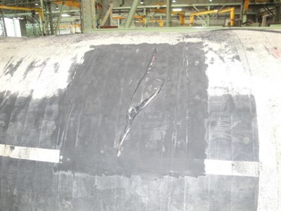 The repair was carried out using a modified version of SOS-12. Surface preparation consisted of roughening the surfaces prior to the application of Belzona® 2911. A rubber mat was bonded over the damaged area with Belzona® 2211, using stainless steel screws to hold the repair in place.