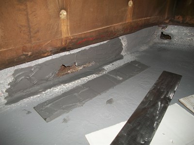 The application was carried out in accordance to a modified version of Belzona Know-How System Leaflet TCC-1. The bulkhead and steel were thoroughly grinded to prepare the surface. Steel doubler plates were bonded over the holes with Belzona 1111.