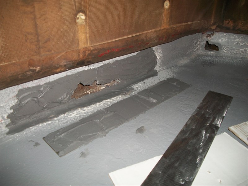 - The completed repair is shown. Belzona 1111 was used to bond the plates over the holes.