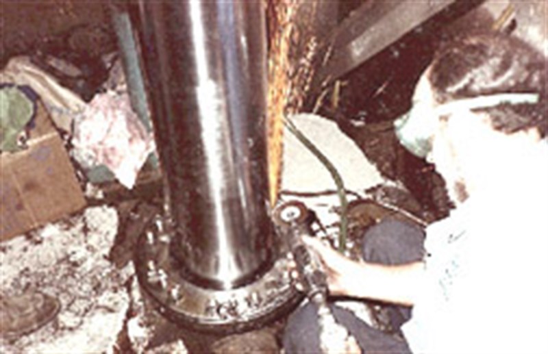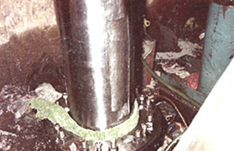 The edges of the scores were squared off and deepened with a side grinder. Belzona® 1111 (Super Metal) was then applied to the prepared surface and dressed down with a file and emery cloth. The application has been in service for over 10 years. As long as the packing and seal area is maintained, the repair should last for a very long time.