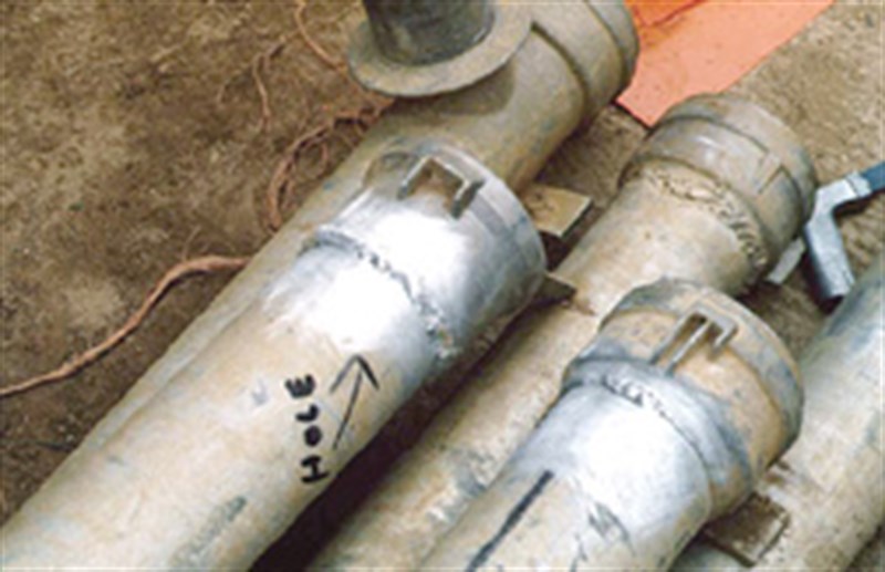 - Close up of pipe couplings where leaks occur and show ineffective welding