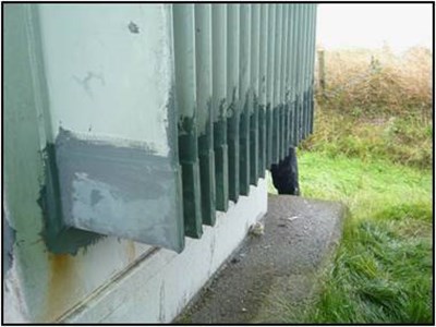 Problem: Lower edge of fins corroded and starting to leak. Problem caused by sheep rubbing against fins, damaging paint system.