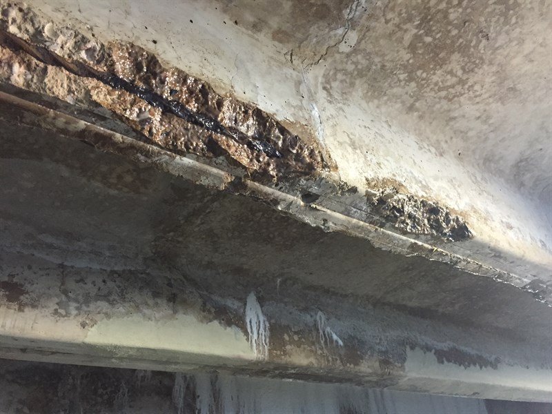 1. Deteriorated overhead lintle 2. Lintle rebuilt with colour matched Belzona 4141 3. Spalled overhead concrete 4. Overhead concrete repairs in progress