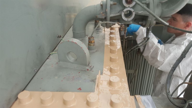Application was carried out in accordance with a modified version of Belzona Know-How System Leaflet GSS-8. Stainless steel caps were fabricated to fit over the bolt heads and the nuts. The gap in between the transformer body and the top cover was filled with Belzona 1161. The caps were filled with Belzona 1161 and clamped onto the bolt heads and nuts. The repair was coated with Belzona 5811