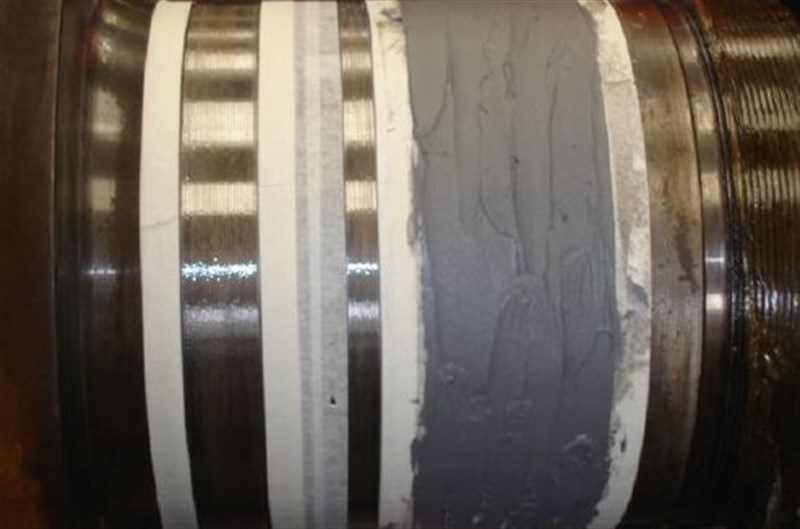 Repair was carried out in accordance with Belzona Know How System Leaflet MPT-1. Surface preparation was obtained by machining, leaving the affected area with a coarse and rough thread profile. Afterwards, cleaning was carried out with a degreaser. Belzona 1111 was applied on the prepared area, and the excess was removed by machining, thus obtaining the required dimensions. Equipment dimensions: weight: approximately 8.5 tons. Diameter: 440 mm. Recovered width: 200 mm.