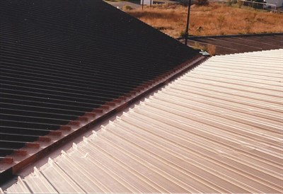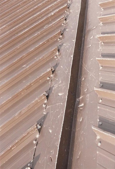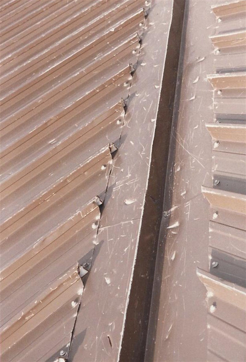 Problem: Continual ice build up in the valley forced water under the roof panels due to poor roof design, causing leaks. Someone decided to remove the ice with an ax, causing holes and more leaks.