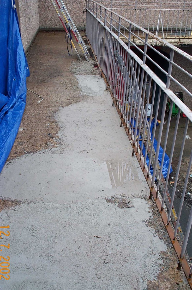 Severity of damage revealed after grit blasting. Application of Belzona® 4131 complete. Application of Belzona® 5231 to entire walkway. View of application after 9 years.
