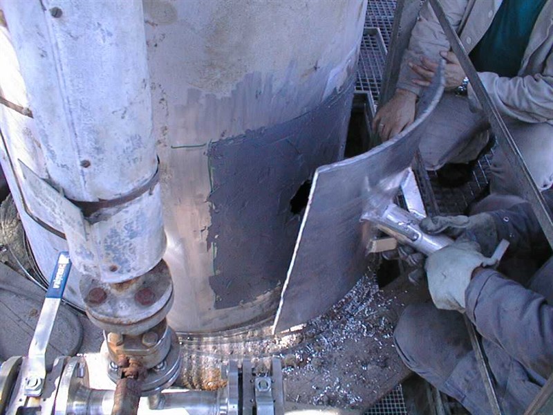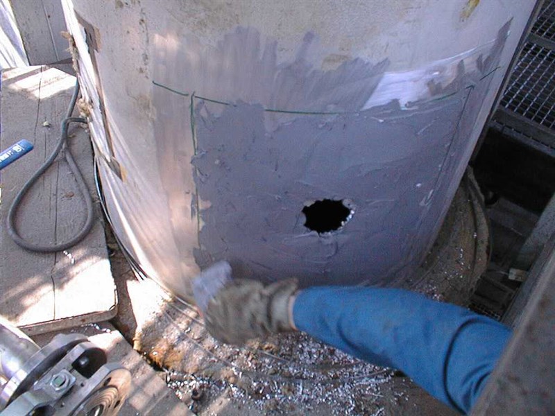 Problem: These safety immersion tanks were damaged around the connection and the walls through the chemical attack of the contained medium coke gas and water) and local steam. The temperatures ranged from 50°C to 104°C