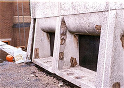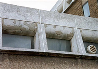 Problem: Carbonation of the concrete allowing corrosion of the steel reinforcing leading in turn to serious spalling of the concrete.