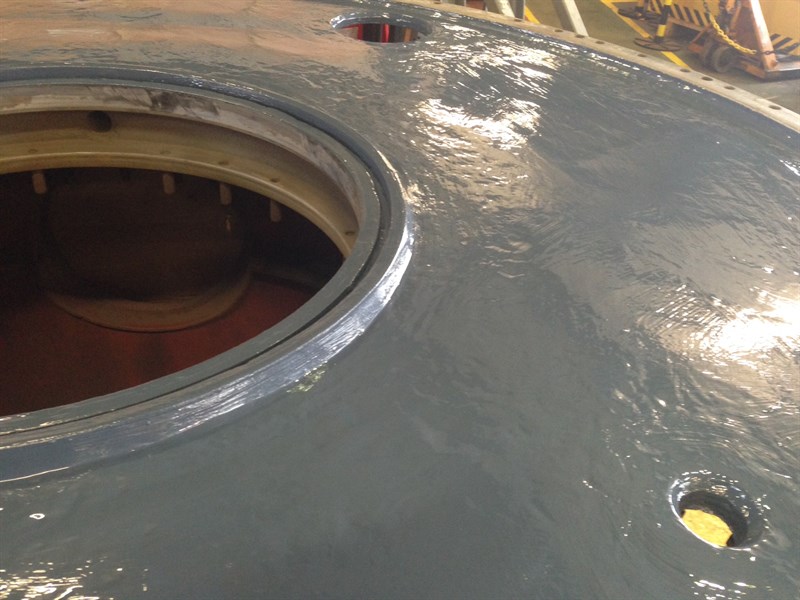 The application was carried out in accordance with Belzona System Leaflets SOS-1 & 2. The unit was grit blasted and salt tested. The inner rim was then built up using a pre-fabricated metal former. The face was also built back up using Belzona 1311. Belzona 1321 was then applied to coat & protect the unit from future erosion/corrosion.