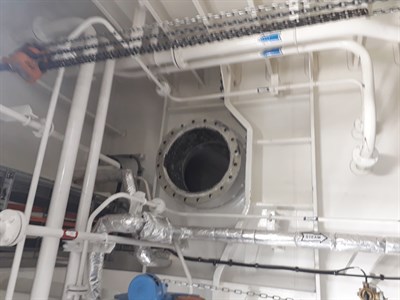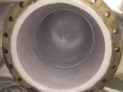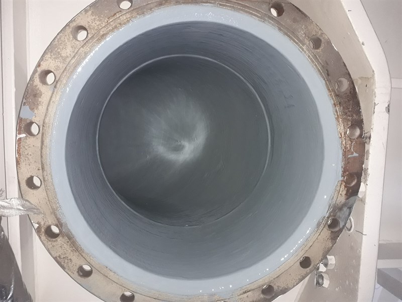 The application was carried out in accordance with Belzona Know-How System Leaflets CEP-03 and CEP-05. Scrubber pipe surfaces have been prepared on board by the shipyard. All surfaces were throughly cleaned. Then the damaged surfaces and pittings were repaired with Belzona 1511 Super HT-Metal before coating with Belzona 1391T to provide overall erosion-corrosion and chemical protection.