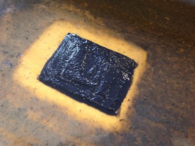 The application was carried out using a modified version of Belzona Know-How System Leaflet SHM-1. The surface was cleaned using a cleaner/degreaser and roughened using the Belzona roughing brush. The area to be repaired was then taped off and conditioned with Belzona 2911 and allowed to dry until touch-dry. Since the belt was only 1/8' thick and not multi layered, it was not possible to remove the top layer and insert the repair material to create a flush surface. Alternatively, a mixing board was used as a backer to the area to be repaired. The hole was filled and the substrate coated with Belzona 2311. Then, Belzona 9341 was embedded with Belzona 2311 and laid over the hole and topped with more Belzona 2311 so it would not leave the reinforcement sheet exposed. Two repairs were carried out in this manner as well as a smaller hole repair without the reinforcement sheet.