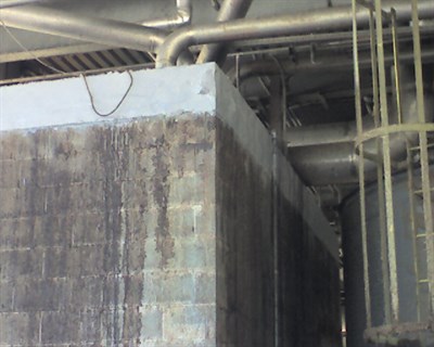 Concrete block tank holding stock being fed to the #1 Paper Machine. It has a pressure release valve to allow blow-by in case of emergencies and it failed. The pressure grew to the point that the solid, reinforced concrete lid lifted and stock blew out the sides.