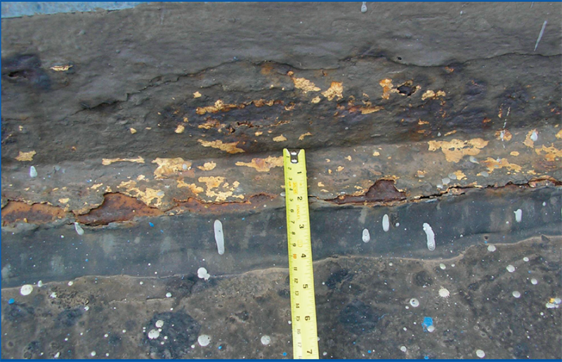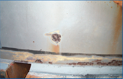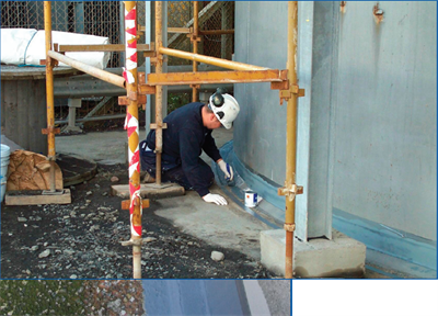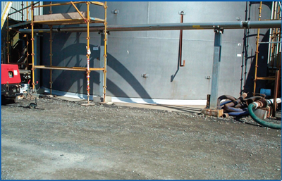 Problem: Original seal had cracked and allowed moisture to penetrate beneath tank base. Problem exacerbated by poor water shed leading to external corrosion.