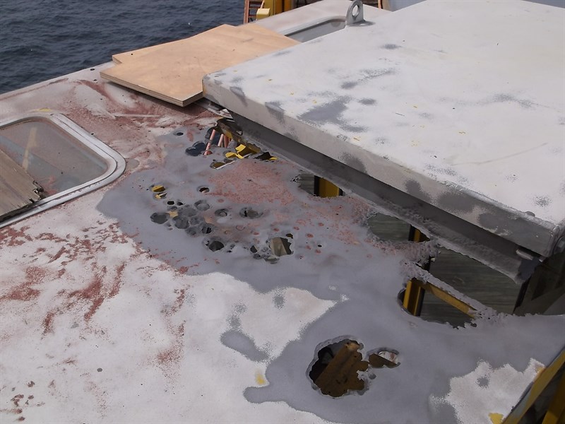 Problem: Severe corrosion deteriorated the crane roof, causing hole through/thin wall defects and loss of structural integrity.