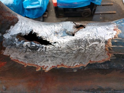 Problem: While the ship was at a shipyard, someone used a steel cable to secure the ship to the dock. The motion of the sea caused the steel cable to work back and forth like a saw and caused heavy damage to two of the hawse holes, one considerably worse than the other. Usually, a 3" rope is used to secure the boat, but after the damage had been done, there were sharp edges that would have frayed or even cut a rope had it been placed through the hawse hole. This presents a major problem since while the ship is processing salmon in Alaska, it must get tied up, and this could cause the ship to break loose during a bad Alaskan storm.