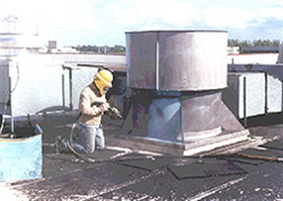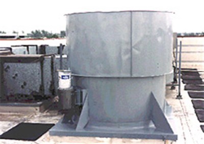 Problem: A six foot diameter exhaust fan is used in case of a fire to evacuate smoke from the burning building. The corroded metal shroud developed holes. Rainwater entered through the holes and caused water damage to the inside of the building.