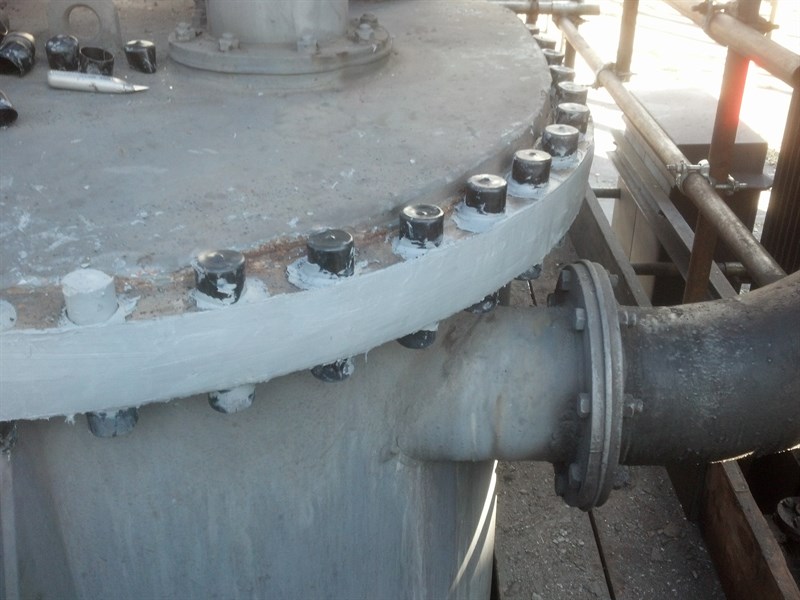 Application was carried out in accordance with Belzona System Leaflet VPF-11. Due to a strict outage period and to enhance full success, the Client dropped the oil level beneath the flange level and created the correct working habitat and heat source to reduce product cure time. Substrate was prepared by MBX Bristle Blaster. Residual leaks were sealed with Belzona 1291 & 1221. Flange joint was sealed by applying Belzona 1161 & Belzona 9341 (Reinforcement Tape). The bolt and nut heads were fully encpasulated using a disposable former containing Belzona 1161. Once cured the formers were removed and the prescribed repair areas coated with Belzona 5831.