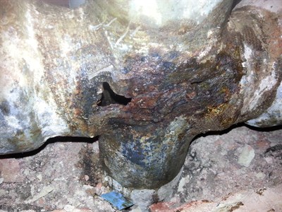 The customer had been quoted £4000-£4500 for the corroded “cross connector” to be cut out using a grinder (which would be very noisy, time consuming and difficult) and a new part installed. For this expensive solution the toilet blocks on all 4 floor levels would need to be closed for 4-5 days. Instead, approx. £120 of Belzona materials were used, the repair took 2 hours and all the toilet blocks were back in service within 4 hours of being closed.