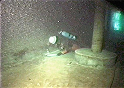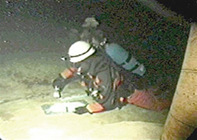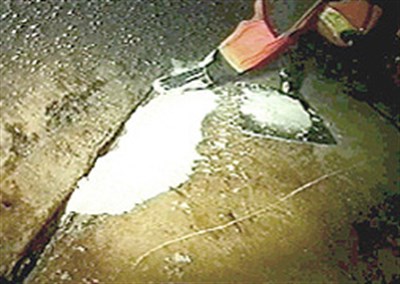 - Diver utilizing a putty knife to force Belzona ® 4111 (Magma Quartz) into concrete cracks