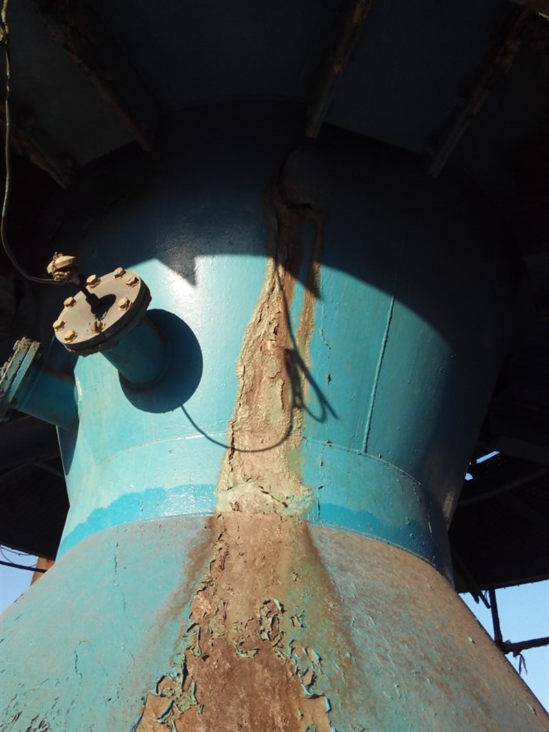 Problem: A small leak had developed at the top section of the scrubber. The resulting leak dripped down onto a lower area of the surface, causing damage to the external coating and resulting in an additional leak.
