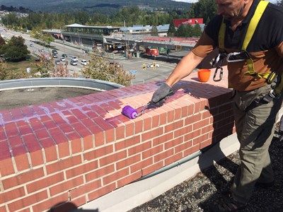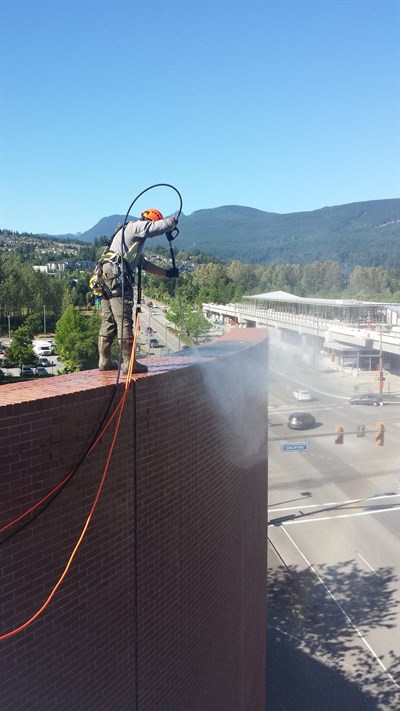 1.View of wall being pressure washed prior to application. It was established at this point that the bricks may have been sealed at some points creating a possible adhesion problem.