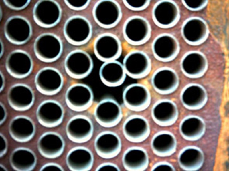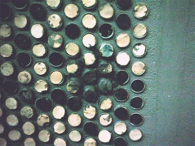 Problem: Hole in a tube sheet due to erosion and galvanic corrosion between copper tubes and steel tube sheet.