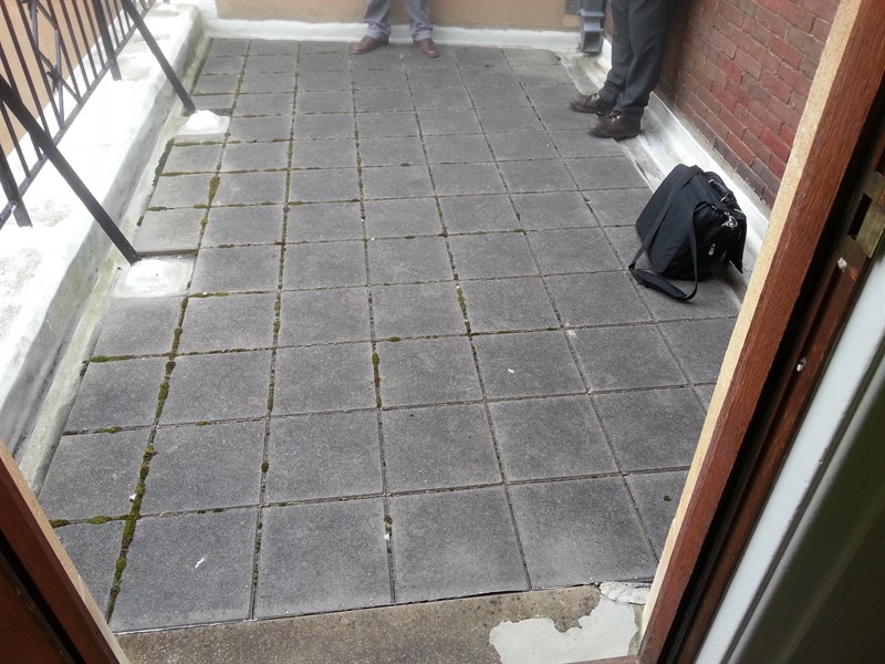 An asphalt balcony, used as a walkway, covered with concrete slabs.