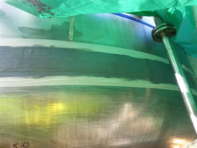 1. Leaking tank 2. First layer of Belzona 9341 (Reinforcement Tape) being laid over the Belzona 4301 3. Three coats of 4301 and two layers of 9341 were applied 4. Finished application being unmasked