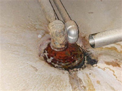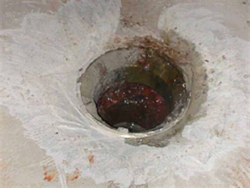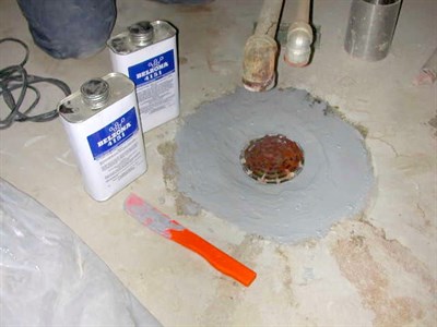 Problem: Leak around drain allowed waste product into the sanitary production packaging floor below.