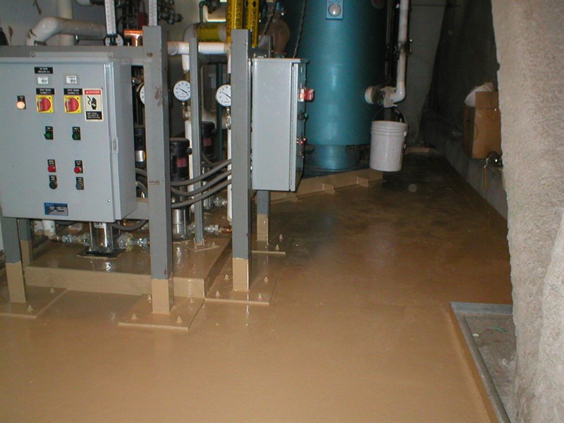 After washing and removing dirt from floor Belzona® 5811 was used to coat the entire floor plus 6 inches up the wall to completely encapsulate the area and to form a containment area.