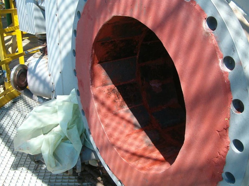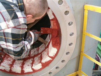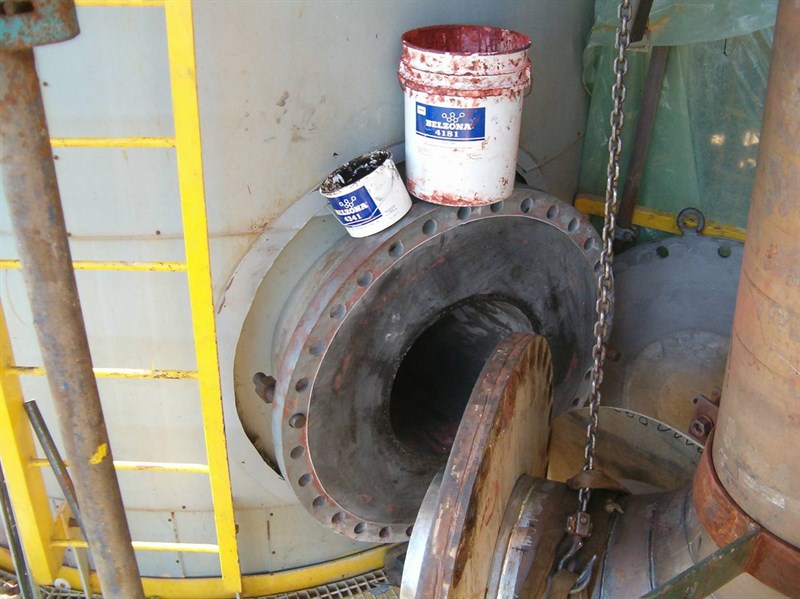 Application was carried out in accordance with Belzona Know-How System Leaflet TCC-3. The internal lining was removed in both manhole areas. The first layer of protection used Belzona® 4181 in conjunction with acid resistant tiles. The flange faces were also protected with a lining of Belzona® 4181 composite additionally covered with Belzona® 4341 coating.
