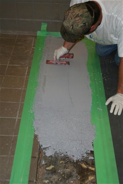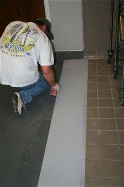 The application was carried out in accordance with Belzona Know-How System Leaflets FPA-1 & -5. The rubber floor was cut out so a slope could be made from the edge of the rubber floor to the tile so that a smooth transition could be created.