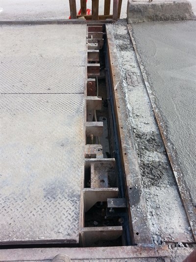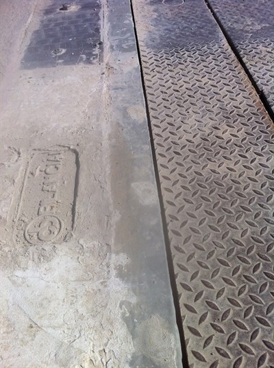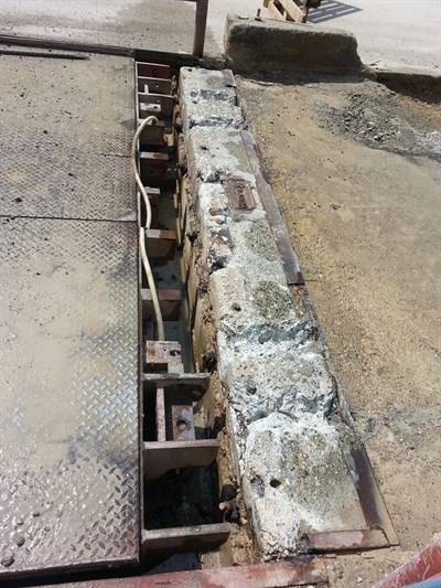 Problem: Concrete surface under the metal plate on the approach to the truck scale was badly damaged due to misalignment of mating faces. Truck scale must be in operation during the two shifts per day, six days per week operation of the quarry so fast repair procedure required.