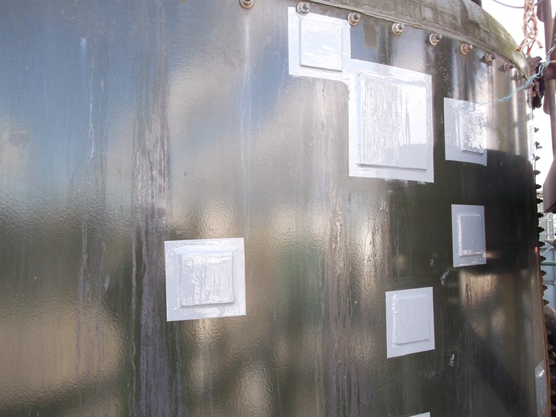 The application was carried out in accordance with Belzona Know-How System Leaflet TCC-3. After cleaning the areas, surface preparation by hand abrasion was carried out. Repair plates pre-coated with Belzona 5831 were cold plate bonded over the through wall defects using Belzona 1161. Finally Belzona 5831 was applied to the entire repair areas.