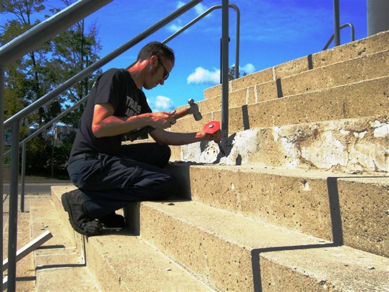 The application was carried out in accordance with Belzona Know-How System Leaflet FPA-1 for rebuilding worn and damaged floor surfaces. The step around the hand rail was prepared by removing any loose material. Belzona 4911 (Magma TX Conditioner) was applied using a brush and Belzona 4131 was applied directly on to the conditioned surface, initially spreading to a general level using normal screeding techniques and then using a metal straight edge.