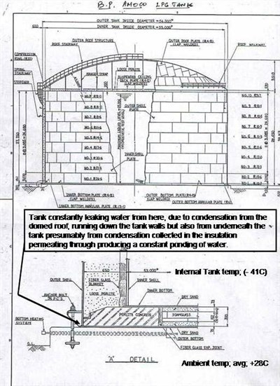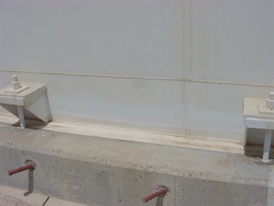 Problem: Annular plate suffering external corrosion from contaminated condensation running down the walls plus the sea water environment gathering between steel and concrete plinth.
